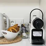 Along with tea and coffee-making facilities, this apartment is equipped with a full kitchen that includes a refrigerator, an oven, and kitchenware.